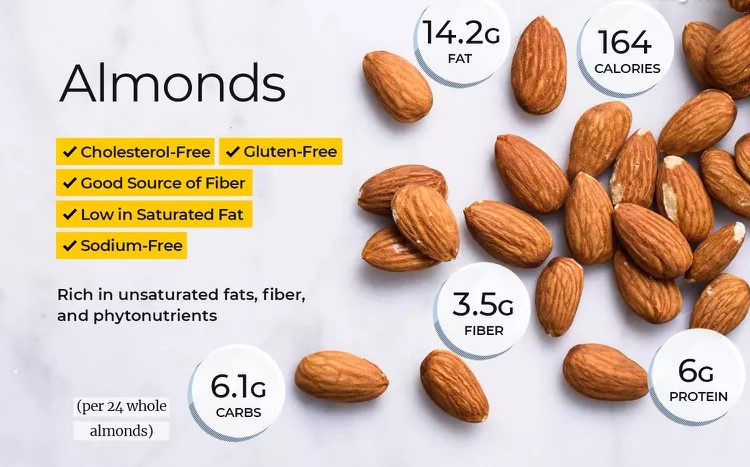 Almonds are naturally low in sugar, cholesterol‑free, and sodium‑free unless salted.