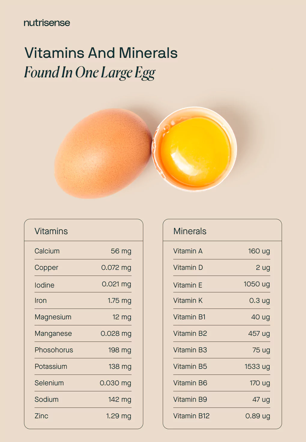 Vitamins & Minerals: Eggs are rich in vitamin A, B vitamins (B2/riboflavin, B5, B12), vitamin D, vitamin E, folate, phosphorus, selenium, etc.