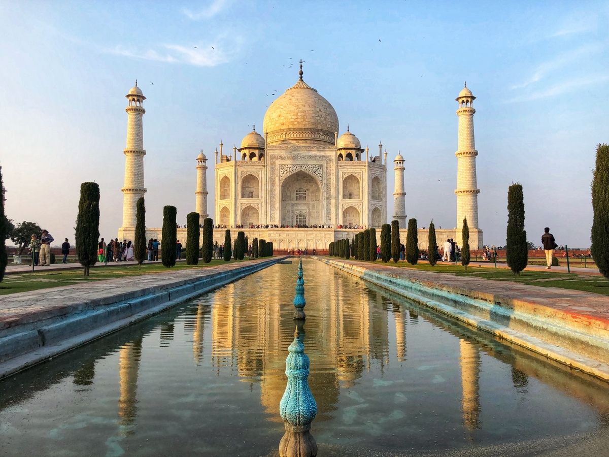 The reflection pools in front mirror the mausoleum. The calm water allows visitors to see the Taj Mahal reflected, enhancing the visual drama.